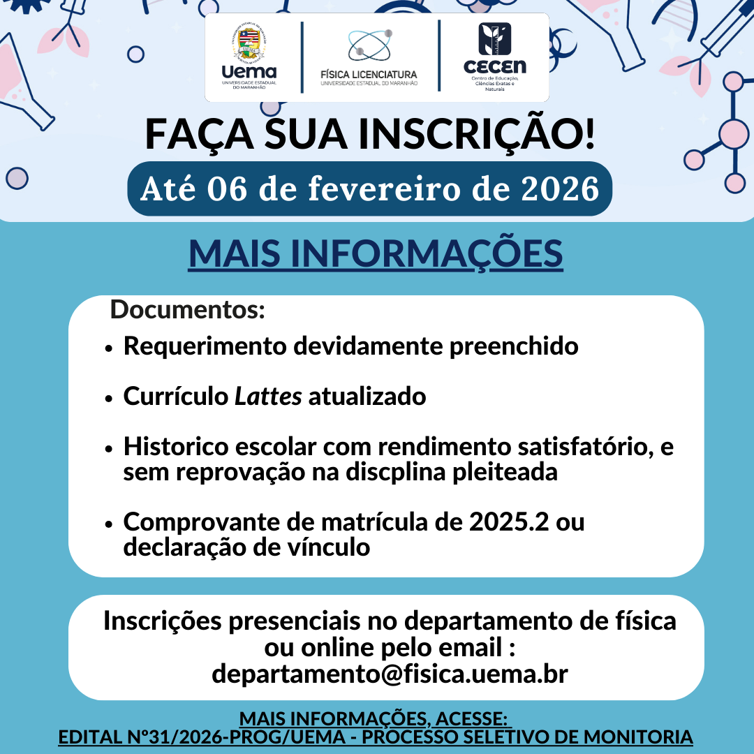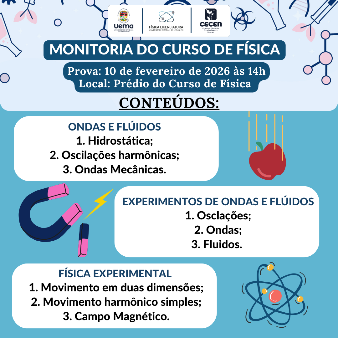 O curso de Física da Universidade Estadual do Maranhão – UEMA, recebeu aprovação pela Resolução n°1816/2024-CEPE/MA e pela Resolução n° 1125/2015-CEPE/MA, e desta forma torna-se público para o conhecimento dos interessados e, em particular, do seu corpo discente, a seleção para monitoria destinada ao preenchimento de vagas.